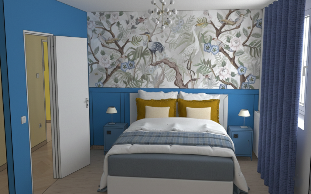 Le papier peint mural nature, tantôt vert, tantôt blanc, accompagne les moulures bleues du