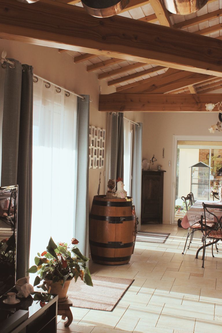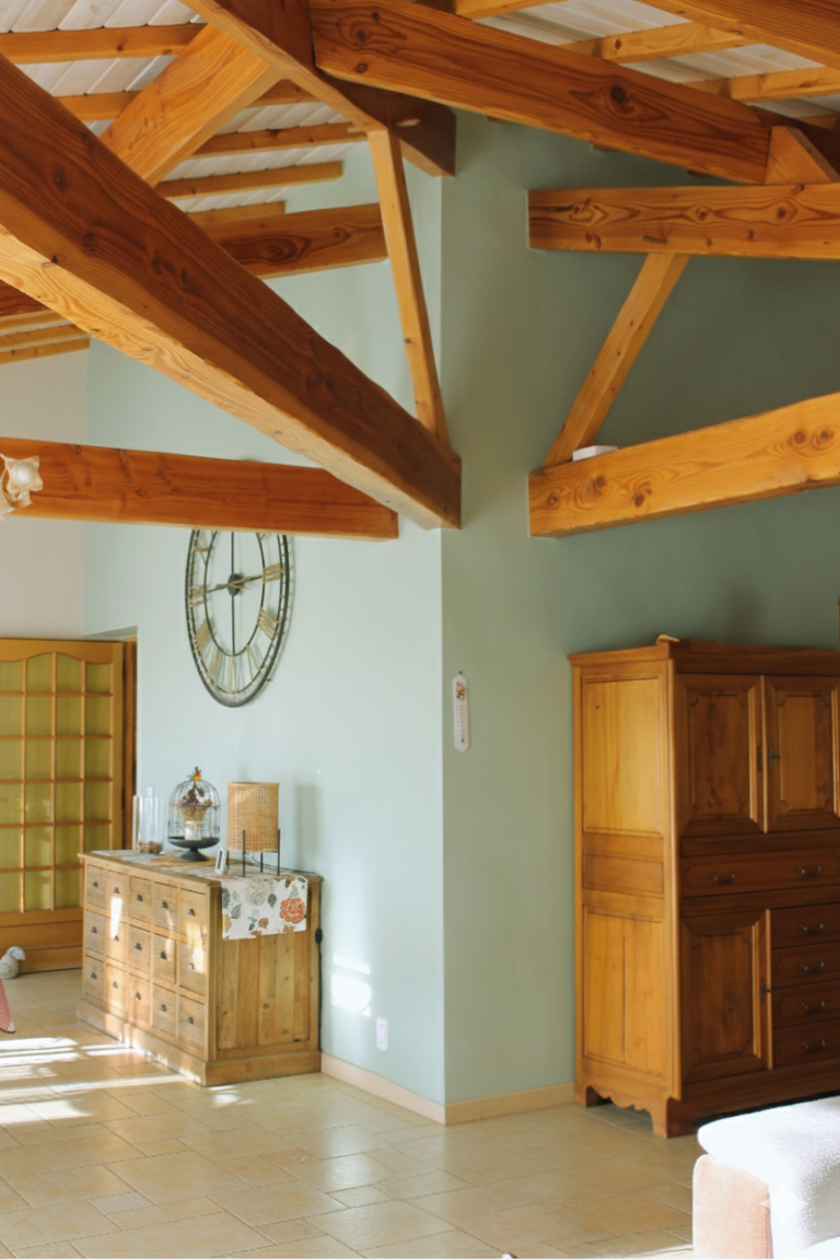 La hauteur sous plafond type cathédrale laisse apparaitre les poutres de la structure, ce qui